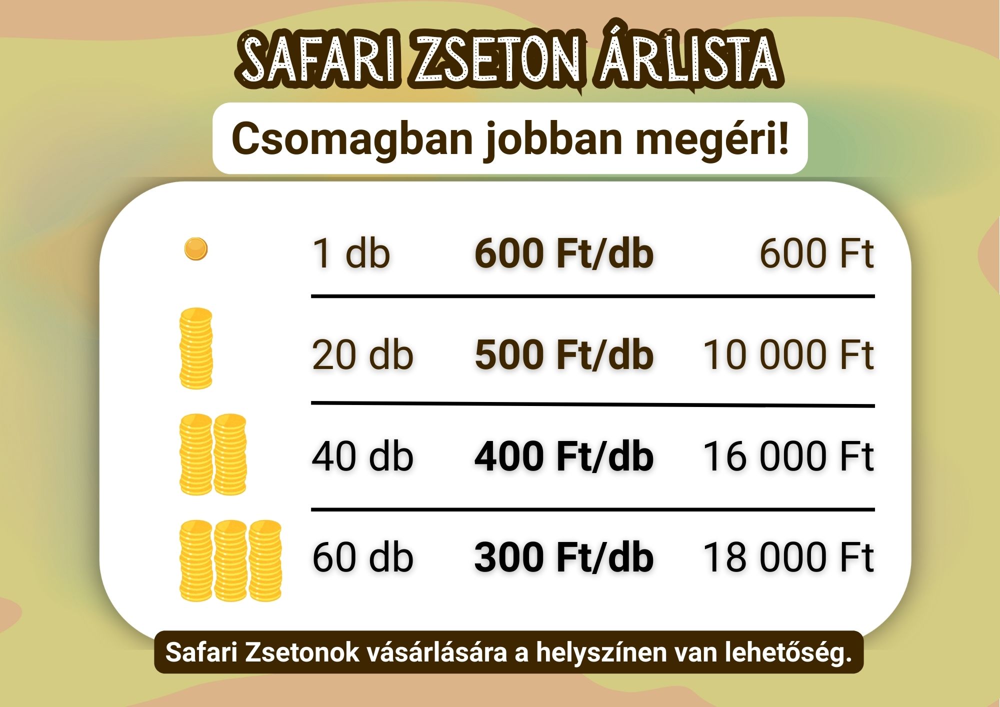 *az összes zsetonos élményünk korlátlan használatára feljogosít (kivétel Safari Csemege, Safari Autó bérlés, ajándéktárgyak és büfé).
